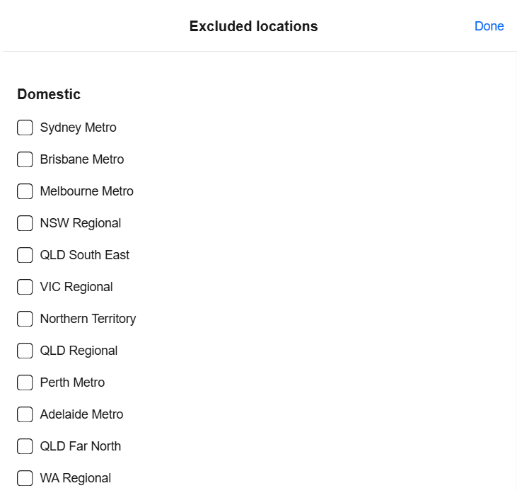 - Domestic postage exclusions are segmented into 15 exclusion zones, with the majority of States split based on metro and regional zones.