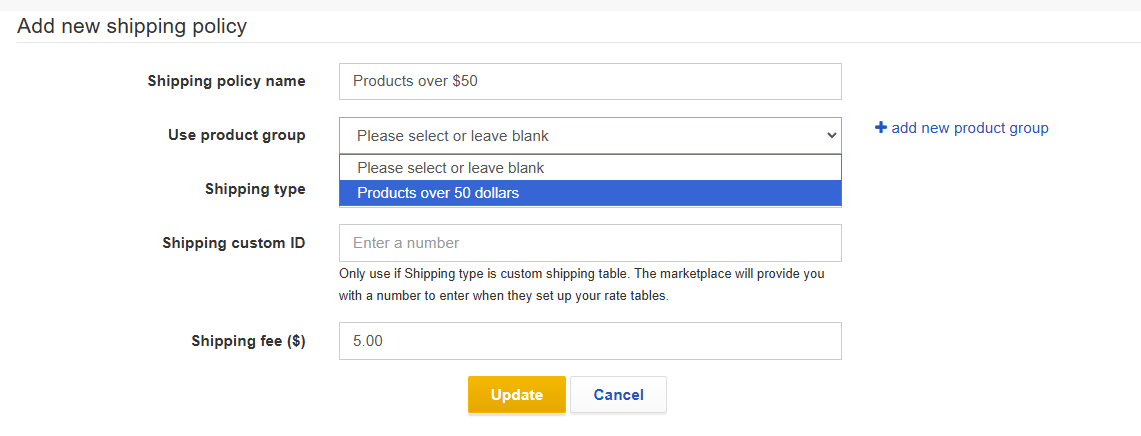 - In our scenario we created a product group for all products over $50 and added it to the corresponding shipping policy.