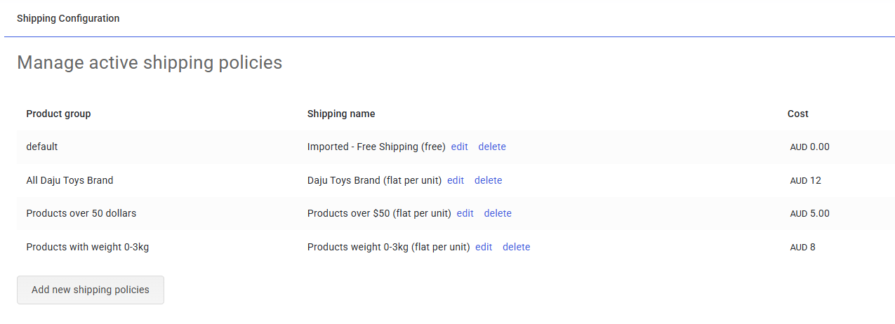 You will continue to have multiple Shipping Policies. We will create all policies automatically based on on what you already have in Woolworths MarketPlus. You will need to choose which policy will be your default policy and which products you want assigned to each policy using product group.