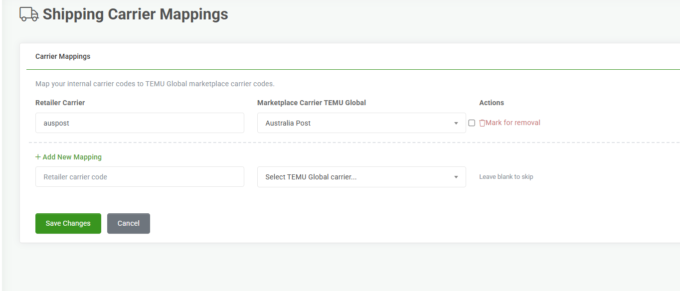 - Add a new mapping by typing in the name of the carrier code you use with the Marketplace Carrier name Temu has.