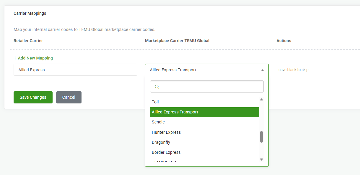 - `For example you might have Allied Express, so you would map it to Allied Express Transport in Temu.
